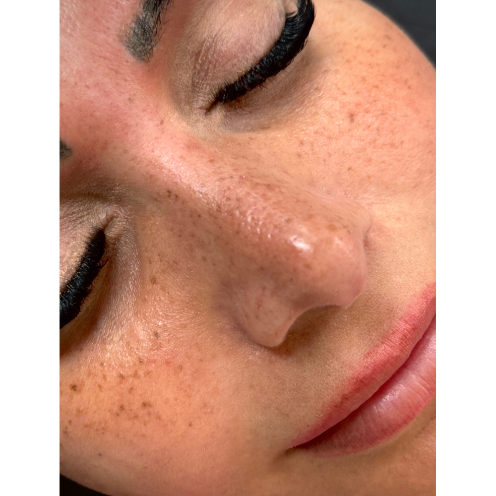 Kosmetiska fräknar ger ett charmigt, lekfullt intryck – som om du alltid fångar solens bästa strålar. Jag placerar dem där de skulle kunna uppstå naturligt och tonar in dem mjukt i huden för ett realistiskt och fräscht resultat.